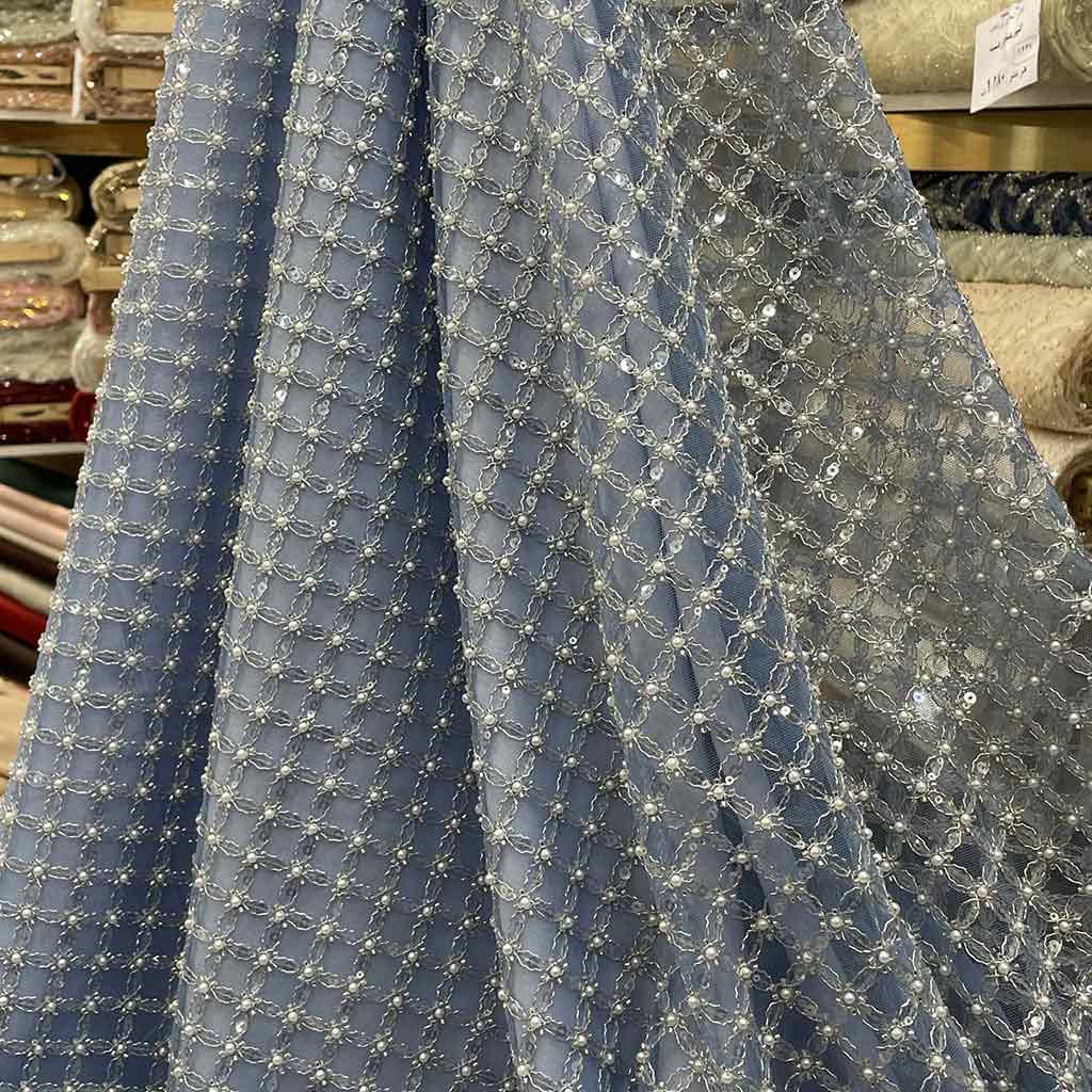پارچه گیپور ملیله و مروارید دوزی آبی